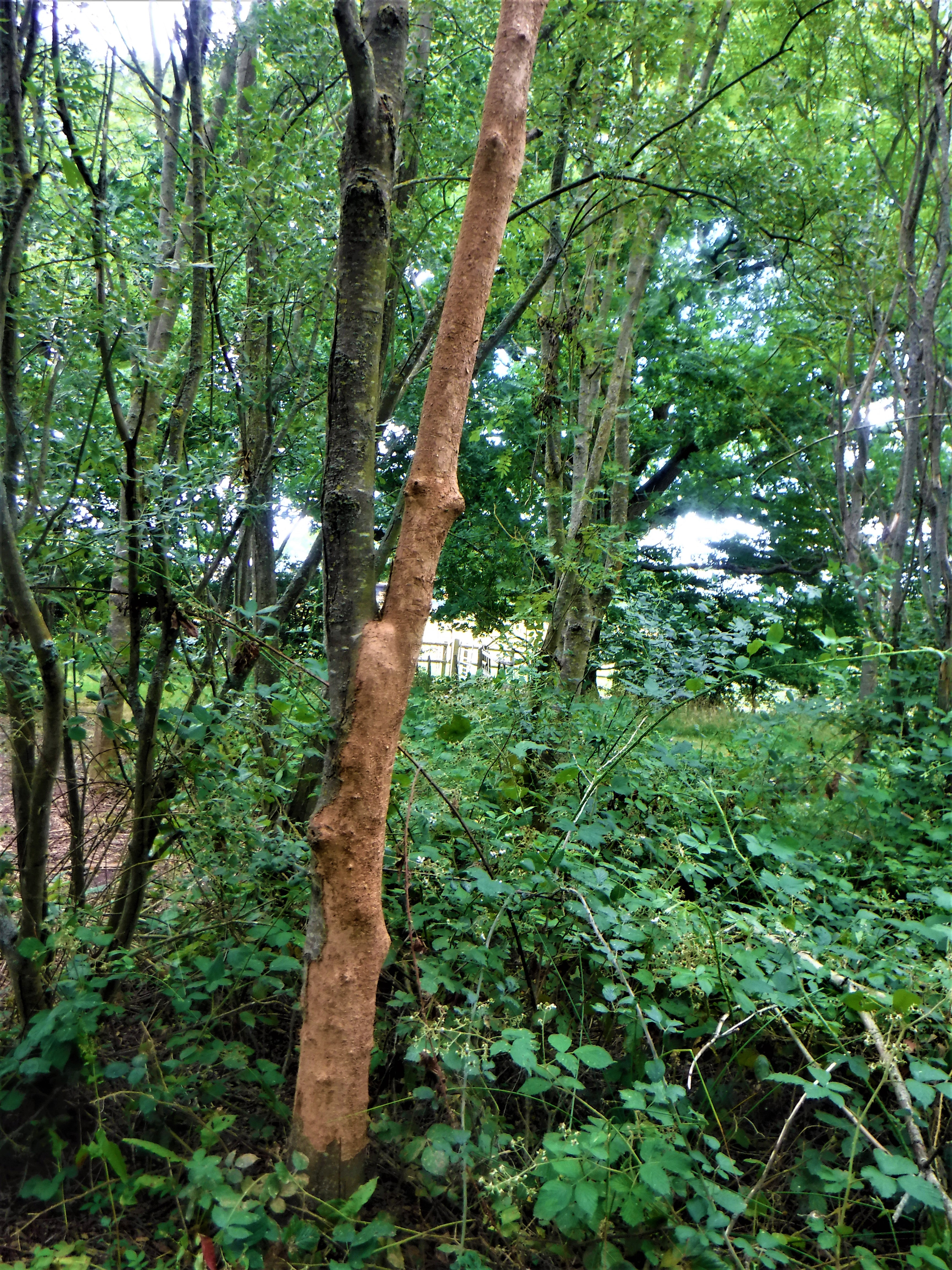 Total monthly rainfall: 48 millimetres. Maximum daily rainfall: 16.5 mm (8th July). There were 11 days with total cloud-cover for at least part of the day. Maximum temperature on the hottest day was 33°C on July 31st. Maximum temperature on the 7 coldest days was 19°C. The remaining 23 days were fairly evenly matched at between 20 and 25°C. As summer is a season of high evaporation and transpiration, the moderate rainfall proved insufficient to prevent pond-water falling to extremely low levels. Strong winds overnight on 3rd/4th July brought down a squirrel drey in a big bundle on the woodland floor. Perhaps it took revenge by strip-barking a 30 year old ash tree on the 9th.